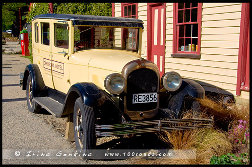 Из Ванаки (Wanaka) выехали поздновато, в 9 часов. Где-то через полчаса пути мы увидели старую стильную машину у отеля. Остановились. Оказалось, что это поселок Кардрона (Cardrona), а машина стоит у одноименного отеля. Мимо такой красоты просто проехать невозможно. Отель как стилизованный поселок первопоселенцев в миниатюре. И не удивительно, ведь он единственное здание оставшиеся с первых дней золотой лихорадки.