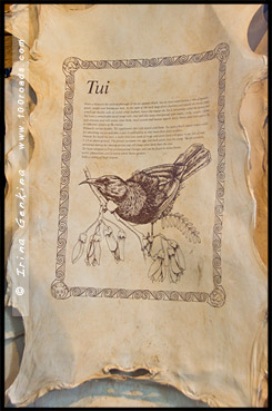 – Сувенирные шкурки поссумов ($30) с описанием птиц киви (kiwi) и туи (tui) – фото кликабельны