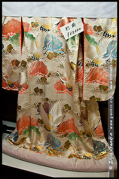 Утикаке (Uchikake/打掛) – роскошная длинная накидка, надеваемая поверх кимоно, подшитая по низу валиком обычно алой (реже – золотой) тканью, чтобы девушка могла грациозно скользить по полу. В настоящее время термин «утикаке» используется только для верхнего кимоно невесты. Данное кимоно с журавлями как символом долголетия. Помните невесту в красном утикаке у Святилищя Ясака (Yasaka Shrine) или в Храме Кудзурю (Kuzu-ryu Jinja), что в Хаконе (Hakone)?