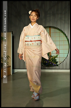[6] – Светлое кимоно Комон для дамы до 40. Ткань шелк-жаккард или как любят говорить в Японии – ткать с узором – эффект ринзу (rinzu) или дамасский (damask). Пояс Нагоя завязанный узлом Тайко. В таком можно и в храм пойти, и в ресторан, и в гости к близким друзьям. Очень милое и элегантное. (в кимоно такого стиля, мы видели девушек при посещении Киёмидзу-дэры в первый наш день в Киото)
