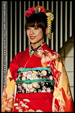 [5] – Кимоно Фурисоде, вернее Ко-Фурисоде (Ko-Furisode/小振袖), с более короткой длиной рукава 76-86 см, для молодой девушки (как и кимоно 1й модели). Снизу под поясом оби повязан еще шелковый пояс. Я не историк японского костюма, но знатоки утверждают, что это ретро-стиль.