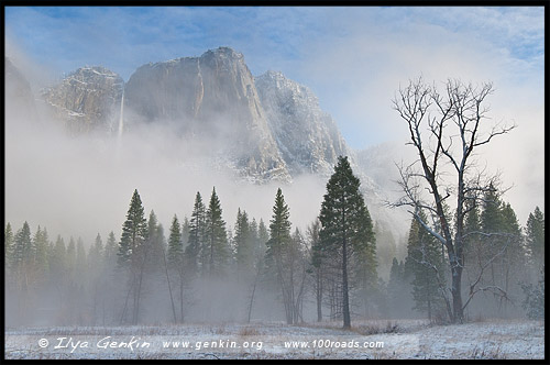– Водопад Йосемити (Yosemite Fall) в утреннем тумане, Национальный парк Йосемити (Yosemite National Park)