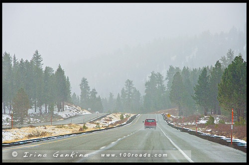 После дивного рассвета, когда у нас было минут 40 для того чтобы запечатлеть красоты, выхваченные первыми лучами солнца на фоне гор укутанных туманом, мы вернулись обратно в свой мотель (8:30). Позавтракали своими припасами (вчера уже искали хоть какое-нибудь кафе или ресторанчик, но без результатно). Когда, возвращались с озера, то заехали на заправку Mobile, но она была закрыта. Там висела бумажка написанная от руки, что до апреля ни заправка, ни кафе не работают. Видимо сезон на Озере Моно (Mono Lake) начинается, когда открывается перевал Тиога (Tioga Pass), на 120 дороге.