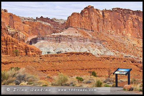 Однако, до прихода европейцев в эти края, территорию Кэпитол Риф местные индейцы называли «Землей Спящей Радуги» из-за геологической палитры осадочных и магматических текстур создающих красочные каньоны, хребты, холмы и монолиты парка. Правда на мой взгляд, это индейское название больше пришлось бы в пору таким местам из Долины Смерти (Death Valley), как – Забриски Пойнт (Zabriskie Point) или Дороге Художника (Artist drive). Может, конечно, все зависит от освещения. Время, в которое мы попали в Кэпитол Риф (Capitol Reef) все же не очень удачное для съемок – за полдень, да облачность 80%.