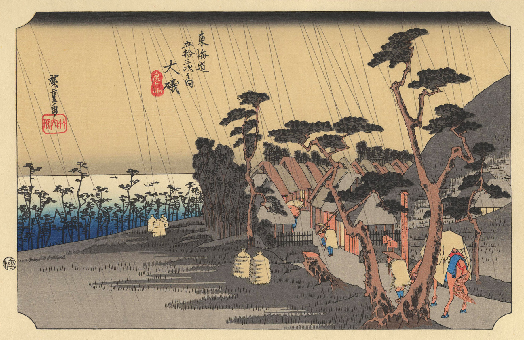 На гравюре изображены путешественники в соломенных плащах входящих в деревню на берегу океана во время проливного дождя (видимо в мае), Кто-то из путников идет пешком, кто-то едет. Они пошли через рисовые поля вдоль узкой дороги, по краю которой высажены сосны.