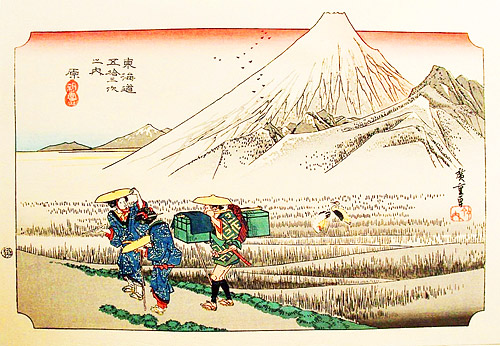 В 1832 году Хиросигэ преодолел Токайдо в составе официальной делегации, перевозившей лошадей для императорского двора. Лошади были символическим подарком от сёгуна, ежегодно преподносимым императору как признание его божественного статуса.