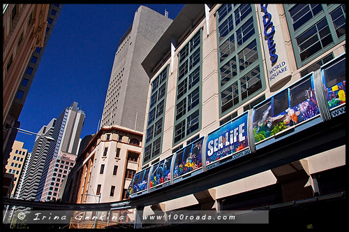 Ведь именно часть монорельсовой дороги, от станции Harbourside до Convention, что проходит над мостом Pyrmont Bridge, самая красивая, самая зрелищная – поезд “в воздухе” на фоне небоскребов.