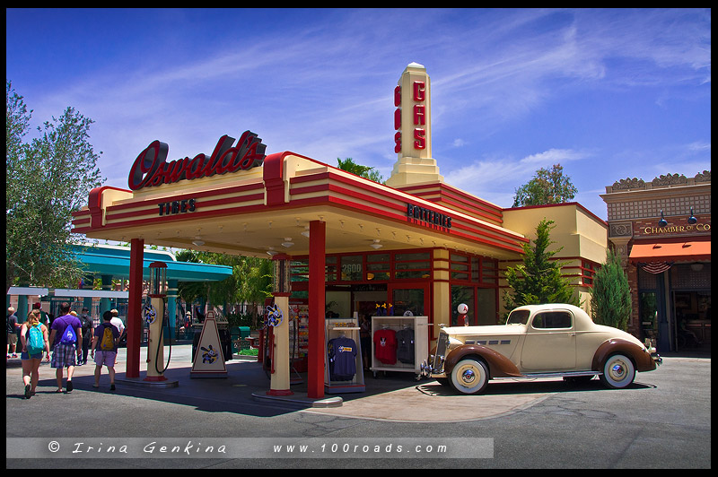 Следующая территория Мир Машин (Cars Land). Сразу скажу, наиболее выйгрешно это место смотрится вечером. Мы посетили это место во время вечеринки, а потом я одна днем. Так днем все выглядит картонным и не ярким.