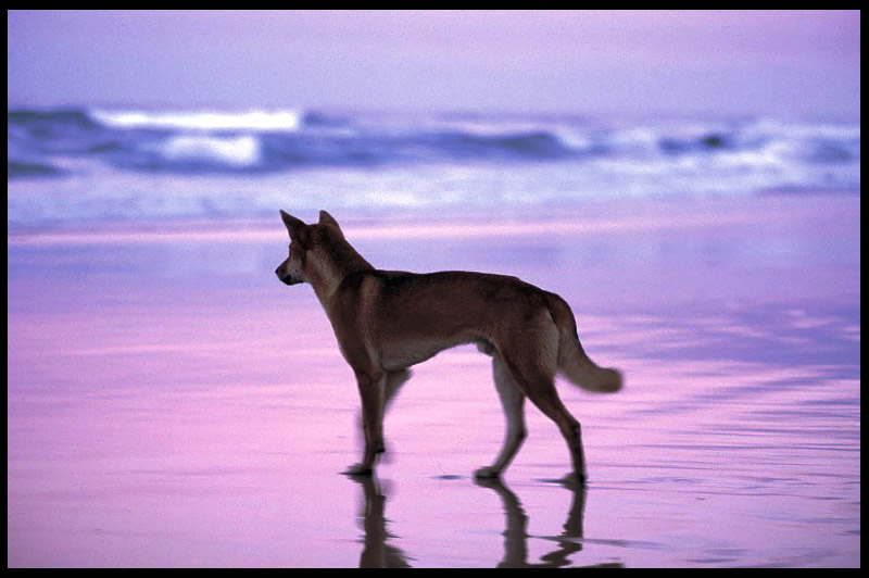– Дикая собака динго на пляже на закате, Остров Фрейзер (Fraser Island)