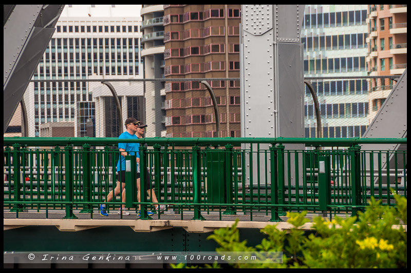 Мы фотографировали раньше от Кенгуру-Поинт (Kangaroo Point), там где проходит тропинка вдоль реки. Теперь решили с обрыва, там где проходит узкая полоска одноименного парка. Парк Кенгуру-Поинт (Kangaroo Point Park) был открыт к празднованию 150 летия Квинсленда (Queensland). До этого тут стояло уродливое здание TAFE. Его снесли, чтобы освободить место для парка. Ныне, это концептуальное общественное пространство, содержащее смесь уличного и садово-паркового искусства, служащее одновременно главным местом для пикника и барбекю местным жителям города.