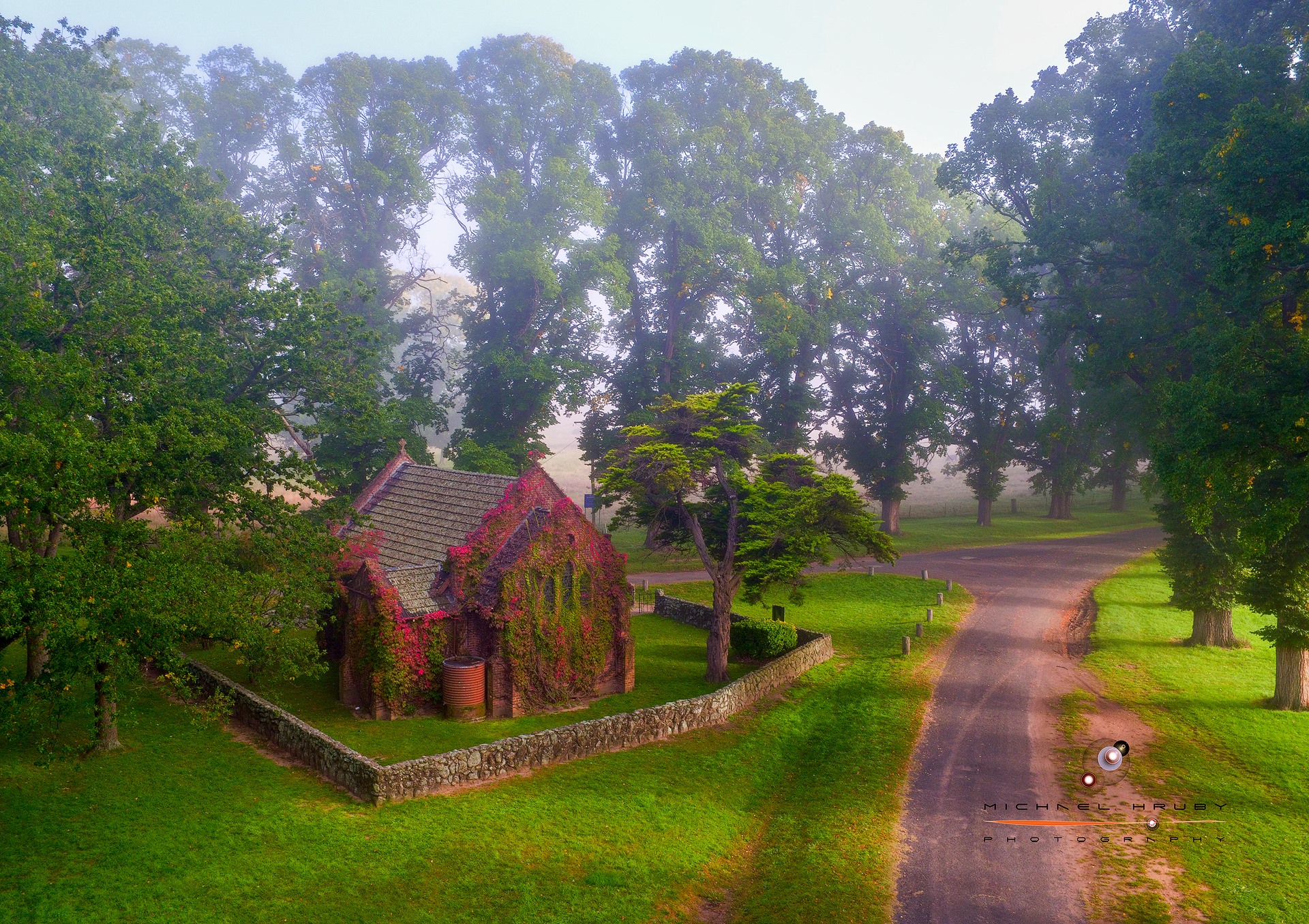 Когда солнце встало и “подчеркнуло” всю красоту Часовни Гоствика (Gostwyck Chapel), высветив красный цвет листьев старого винограда и приглушонность ярких красок туманом, появился фотограф с дроном. Как потом выяснилось, это был Michael Hruby
