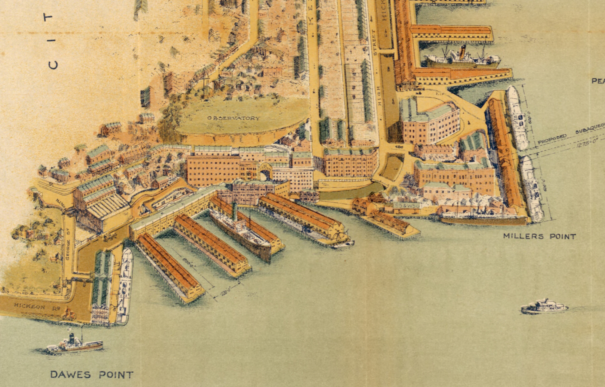 Во время Великой депрессии Хиксон-роуд (Hickson Road) была известена как «Голодная миля» из-за того, что сотни мужчин стояли в длинных очередях вдоль причалов в поисках работы.