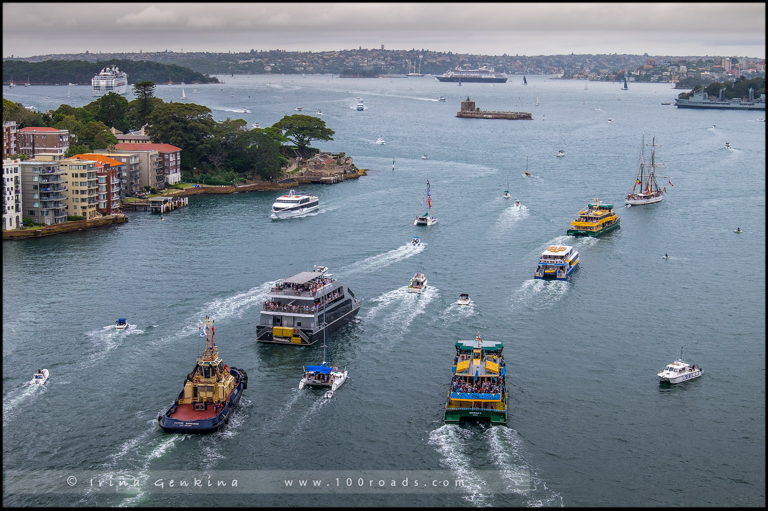 К 10 часам акватория Порта Джексон наполняется яхтами участницами парада и яхтами со зрителями, а так же кораблями, парусниками всех форм и размеров, ну и конечно кораблями флота.