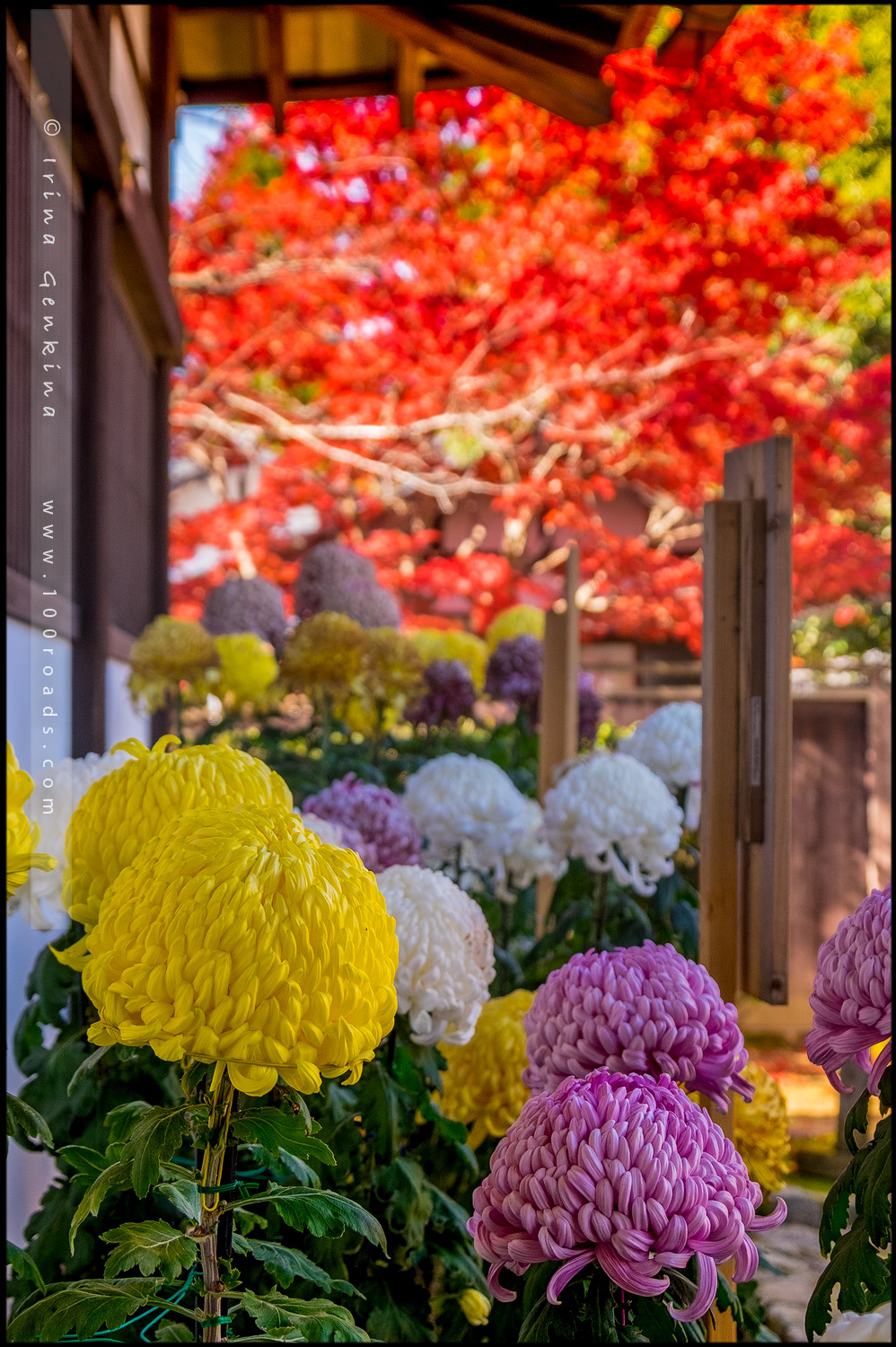 Когда мы подошли к храму Мансю-ин (曼殊院 / Manshu-in), то были просто околдованы листвой осенних деревьев, что окружают храм. Лучшие место, где можно любоваться кленами, это там, где клены окружают внешнюю стену храма и восточные ворота, а именно Тёкусимон (勅使門) – Императорские ворота.