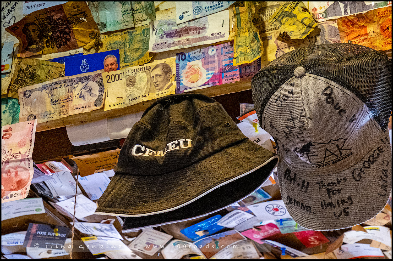 Надо отметить, что обеденный зал отеля (тут его именуют ресторан) полностью сделан из железнодорожных шпал Старого «Ган». Каждый квадратный дюйм пространства стен и потолков барной зоны покрыт визитками останавливавшихся путешественников, картинками и купюрами из разных стран.