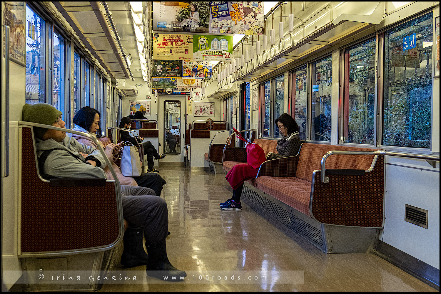 Что приятно в таких ранних поездках, это полупустые поезда и возможность полюбоваться самой дорогой. Ведь японские железные дороги просто завораживают. Словно попадаешь в другой, не реальный мир. Поезд протискивается между домами или идет вдоль края горы, ныряет в тоннели, проносится по мостам над обрывами и все так обыденно и спокойно. Дорога чарует, удивляет и успокаивает.
