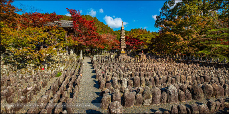 Следуем плану. Далее, храм Адасино-Ненбуцу (Adashino Nenbutsuji Temple / 西院の河原) – древнее кладбище. Тут около 8000 буддийских статуй, поставленных в память о тех, кто умер без родственников. Место когда-то, названное Сайнокавара (русло душ) вдоль Санзунокава (река Стикс), как говорят, отделяет небесную Чистую Землю от этого мира.