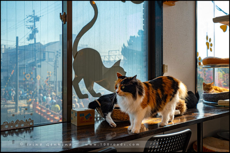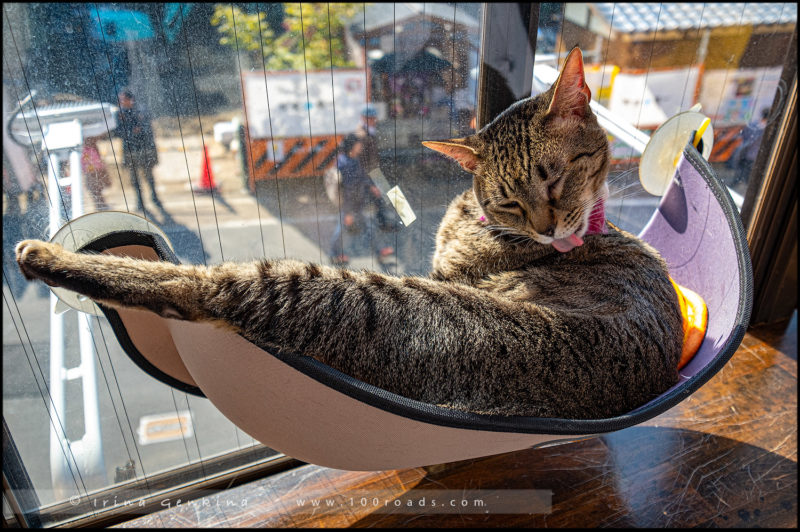 Наверное, это было особым знаком. Гуляя рано утром по тропинкам Святилища Фусими Инари, мы встречали котеек. Останавливались около них, разговаривали, фотографировали, а после совершенно случайно попали в кошачье кафе. Похоже, местные кошки решили узнать нас побольше. Вот и не верь в духов святилища.