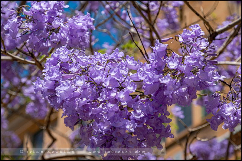 О джакаранде я писала, но не на станицах этого сайта, а ведь цветение джакаранды в Сиднее, это такое же событие, как цветение вишни или сакуры в Японии. В Сиднее, во время цветения, так же как и в Японии, народ собирается в парках на пикник, гуляют и фотографируются на улицах, где посажены эти деревья.