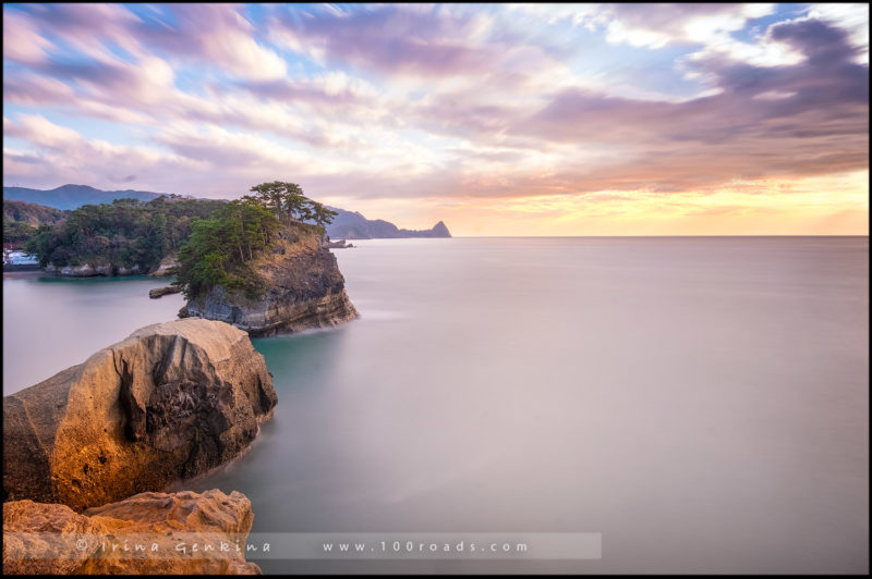 Рассвет этого дня мы встречали у «Ушицуки-джима» (Ushitsukiiwa / 牛着岩). Это две скалы на переднем плане так называются. Если перевести, то смысл будет таким – «острова, где коровы были выброшены на берег».