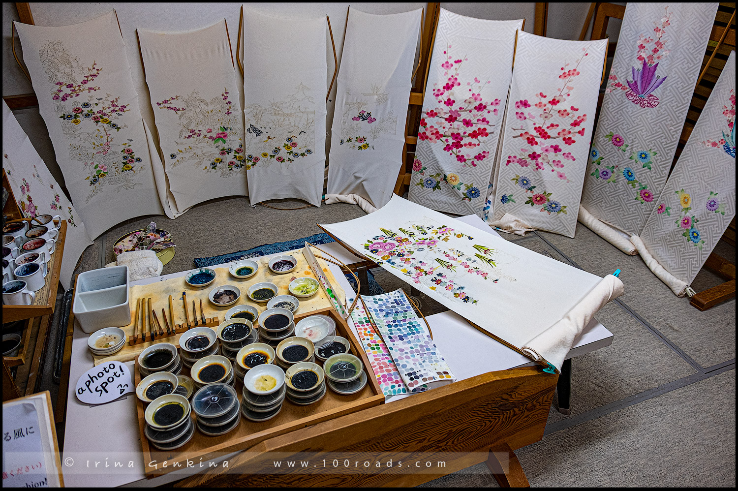 Как говорят в путеводителе – «Тем, кто интересуется тканями и творчеством кимоно, отправляйтесь на запад по дороге рядом с останками семьи Такада. Примерно в двух кварталах справа находится Нагамати Юзэн-кан, старый склад, немного в стороне от улицы, где на втором этаже находится галерея, а сложные, многоступенчатые процессы окрашивания показаны на третьем этаже».