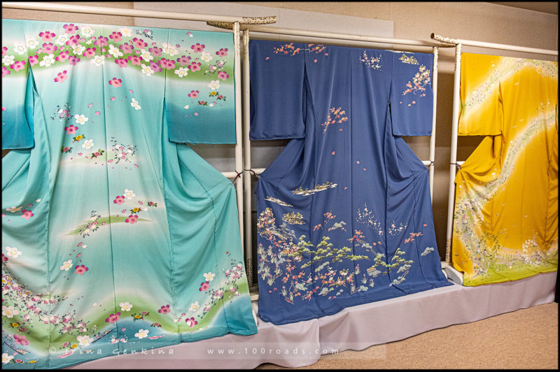 Первая остановка внутри здания – это мастерская на 3-м этаже, где можно увидеть весь процесс изготовления кимоно. Вернувшись на второй этаж, можно осмотреть впечатляющую коллекцию традиционных кимоно, ханайомэ норэн и других предметов декора.