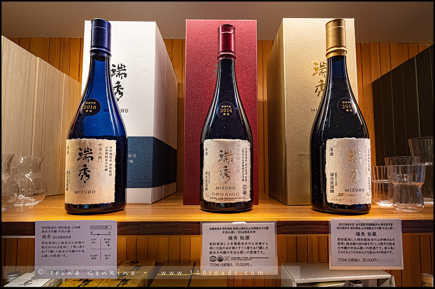 Премиум класс был – KAGATOBI (加賀鳶) – назван в честь пожарных периода Эдо. На фото “SENNICHI-KAKOI” JUNMAI DAIGINJO выдержанный при низкой температуре (этикетка с красным цветом из двух слева) и JUNMAI GINJO