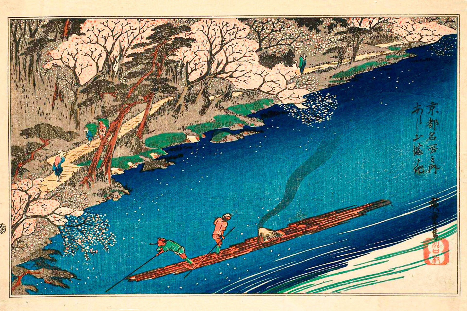 У знаменитого художника-графика Утагава Хиросигэ (歌川広重) есть несколько серий гравюр. Одна из серий называется «Знаменитые виды Киото», в которой кроме есть гравюра – «Цветение сакуры в Арасияме».