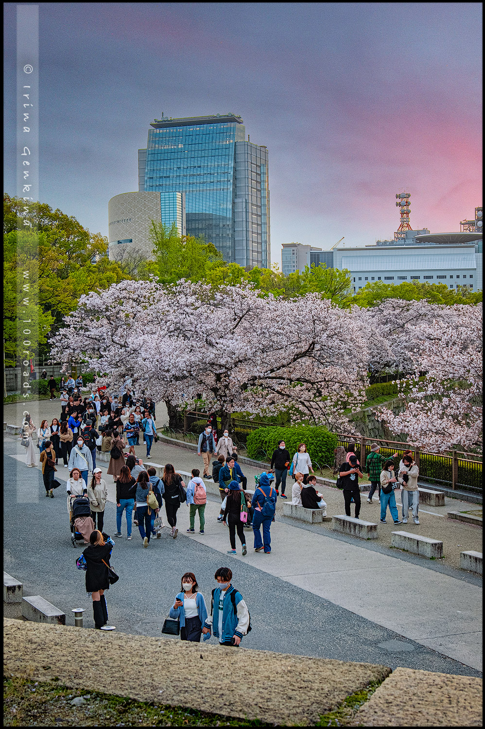 На территории замка Осаки и прилегающем парке (Osaka Castle Park / 大阪城) есть много мест, где можно устроить пикник и увидеть цветение сакуры. Цветущие вишни в этом парке раньше были стандартом для объявления о начале периода цветения в Осаке.