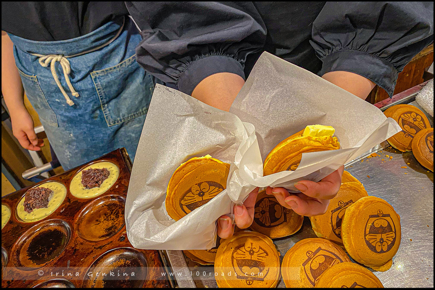 Покидая территорию замка Осаки решила утолить подступающий голод. Купила вот такие местные блинчики с пастой из красной фасоли анко внутри – дораяки (どら焼き, 銅鑼焼き – «жареный гонг»).