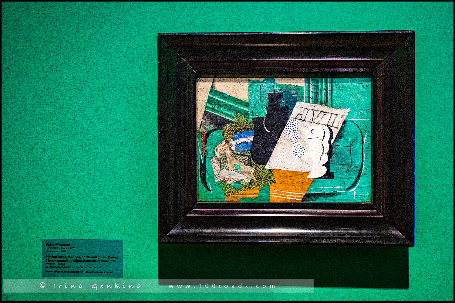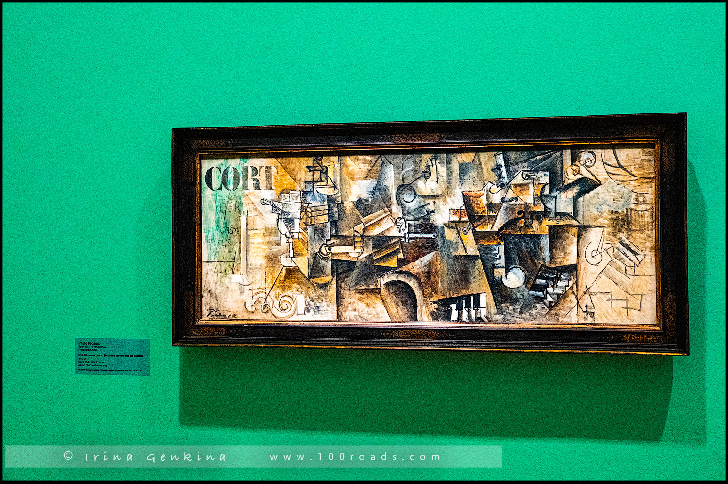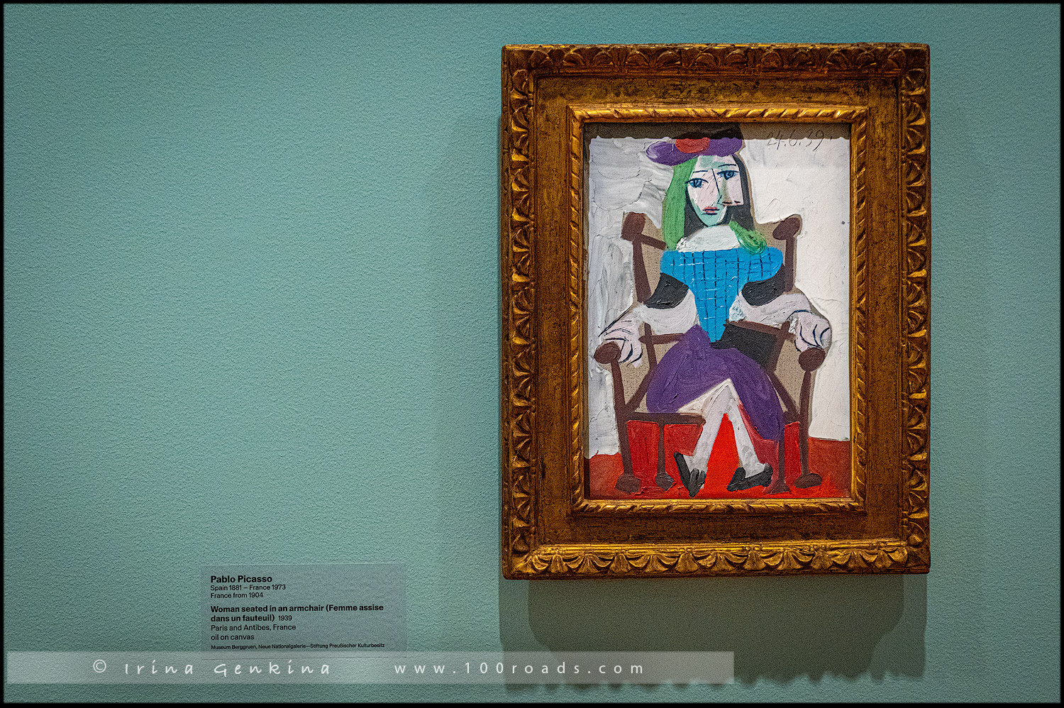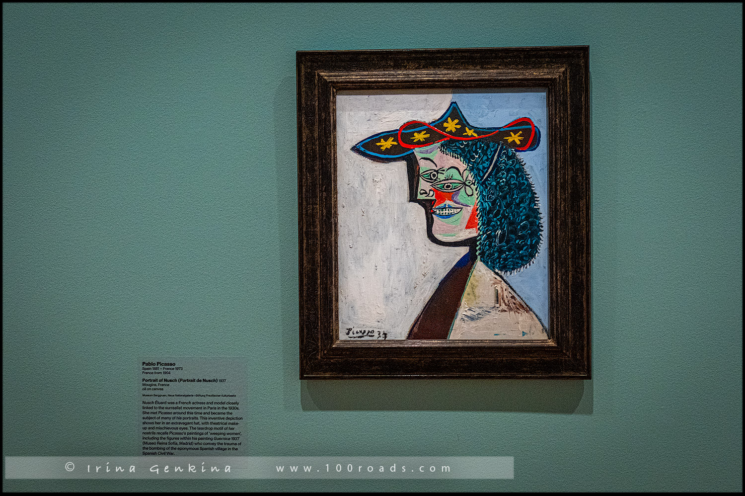 Пикассо представлен в экспозиции произведением «Женщина в разноцветной шляпе» (1939). Эта работа относится к его позднему периоду и демонстрирует синтез различных стилей, включая кубизм и сюрреализм. Использование ярких цветов и деформированных форм подчеркивает эмоциональное состояние модели и отражает внутренние переживания художника.