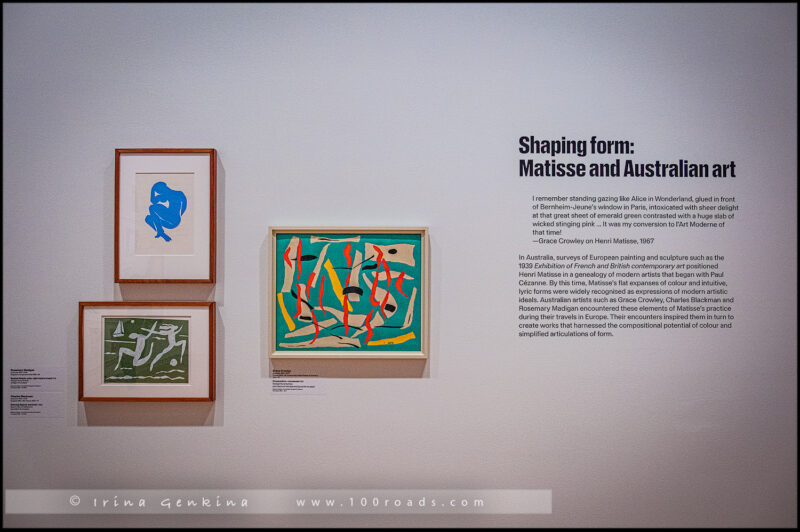 Работы европейских мастеров представлены в контексте их влияния на австралийских художников, таких как Джон Рассел, который оказал значительное влияние на молодого Матисса, познакомив его с цветом. Также мы можем увидеть произведения Лины Брайанс и Марселлы Хампель, отражающие развитие австралийского модернизма.