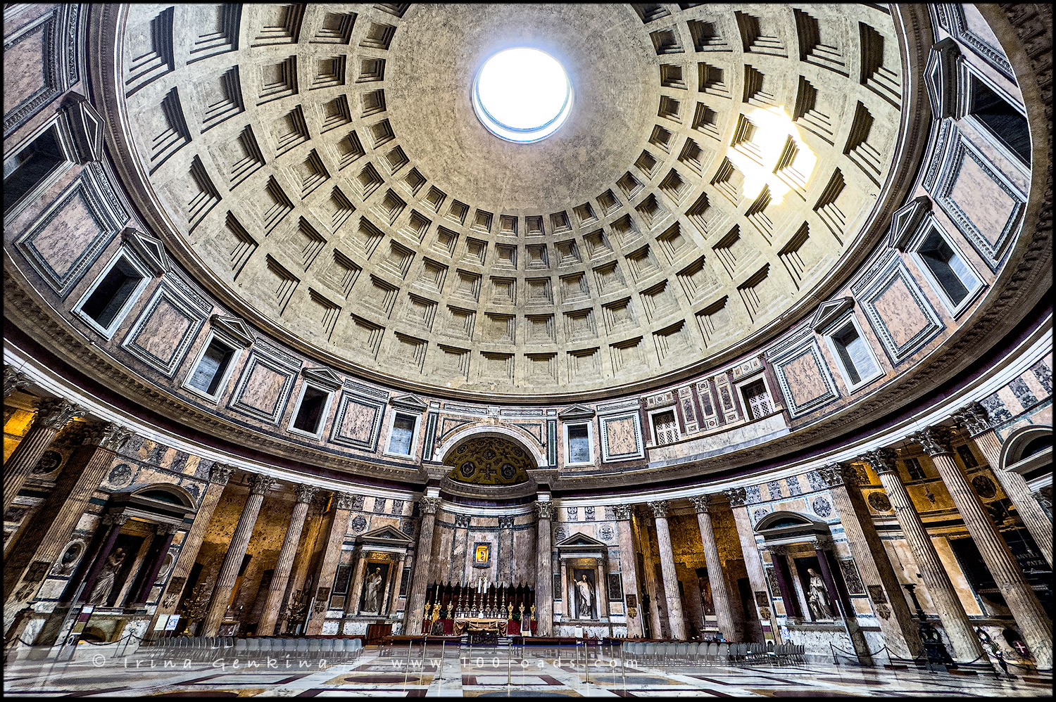 Зайдя внутрь, ты как будто входишь в идеальную сферу. Впечатление ошеломляет – над тобой возносится гигантский купол диаметром 43.3 метра — ровно столько же, сколько высота от пола до вершины. Это первая в истории архитектуры конструкция, где внутренний объём образует совершенный шар. Пантеон – это не просто храм, это модель космоса, небесная сфера, помещённая в камень.