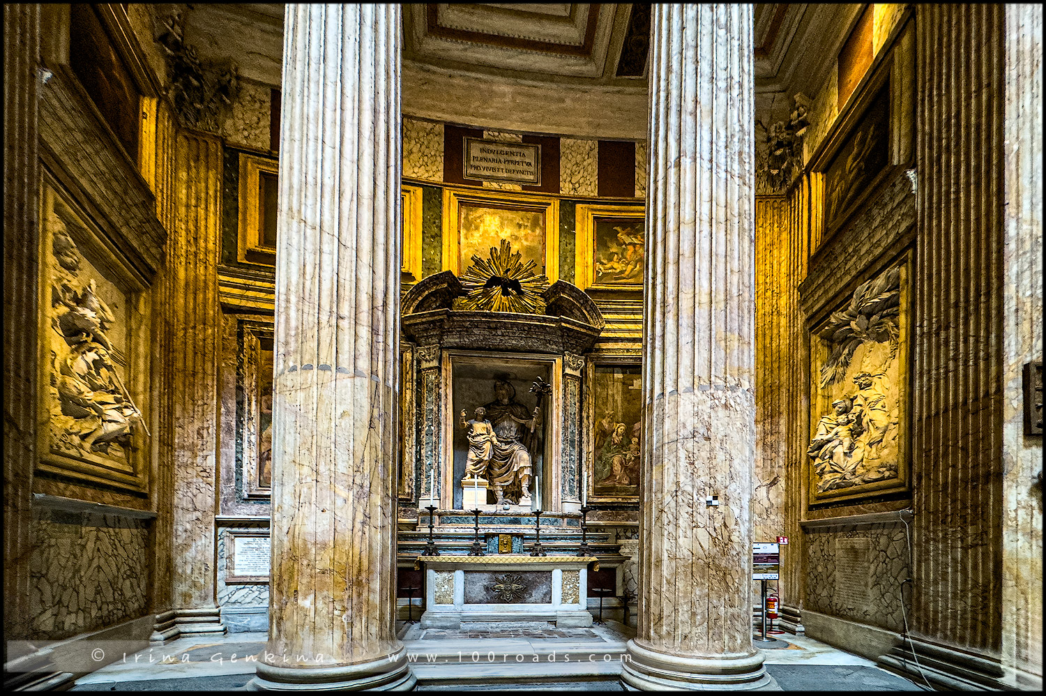 В храме есть семь ниш, размещенных парными колоннами, которые первоначально служили для поклонения божествам, связанных с культом планет: Солнцу, Луне, Венере, Сатурну, Юпитеру, Меркурию и Марсу. Когда Пантеон освятили в христианскую базилику, эти ниши использовали для установки алтарей и гробниц известных людей.