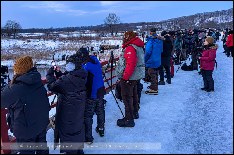 Мы пробыли у Otowa Bridge (音羽橋) до 7:30 и решили поехать к месту кормежки – Цурумидай (鶴見台). В инете была найдена информация, что кормежка происходит около 8:30 и в 14:30. Стали ждать в машине. Судя по записям выставленным в будке смотрителя, вчера, в 9 утра журавлей было 204 и это самое большое число.