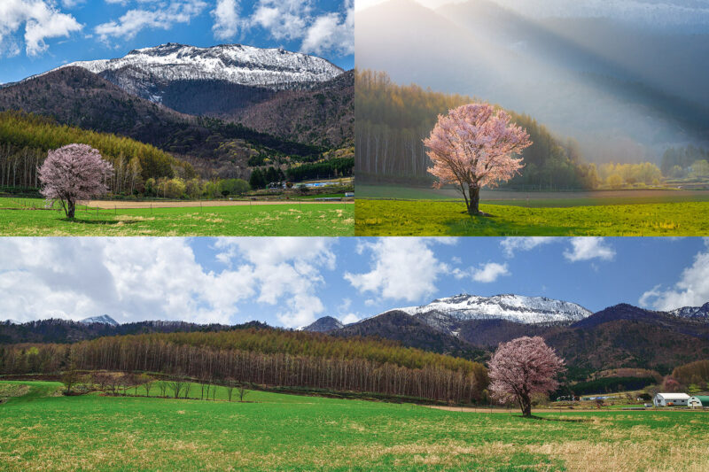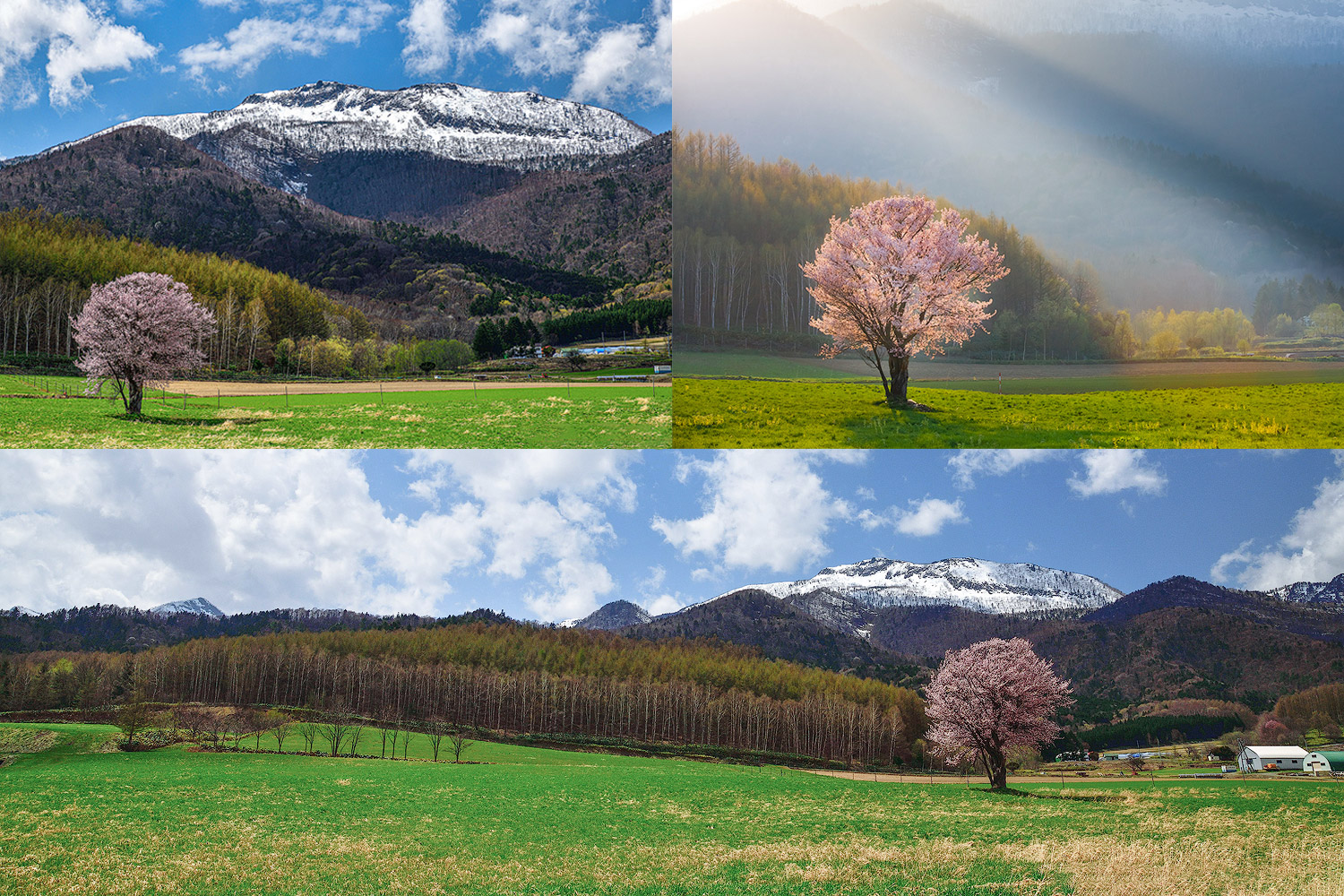 Чуть подробнее о фото выше – «Одинокая сакура Камигорё» (One Cherry Tree of Kamigoryo) На обширных зелёных пастбищах у подножия заснеженных гор и просторов Фурано возвышается эта одинокая сакура — エゾヤマザクラ (Ezo-yamazakura), или One Cherry Tree of Kamigoryo (上御料の一本桜, Kamigoryo no Ippon Sakura). Это отдельно стоящее дерево стало символом северной весны благодаря своей простой красоте, подчёркнутой суровым фоном природы.